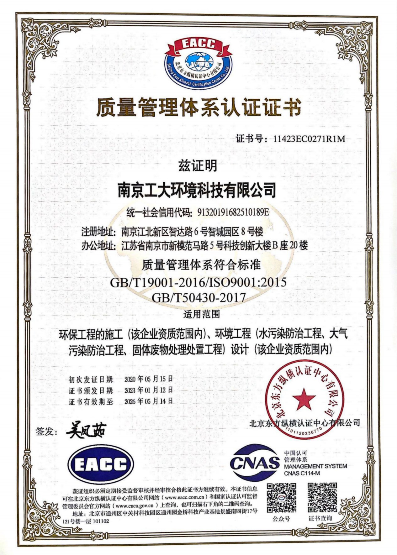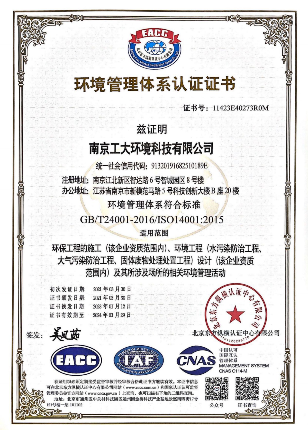 环境管理体系认证证书