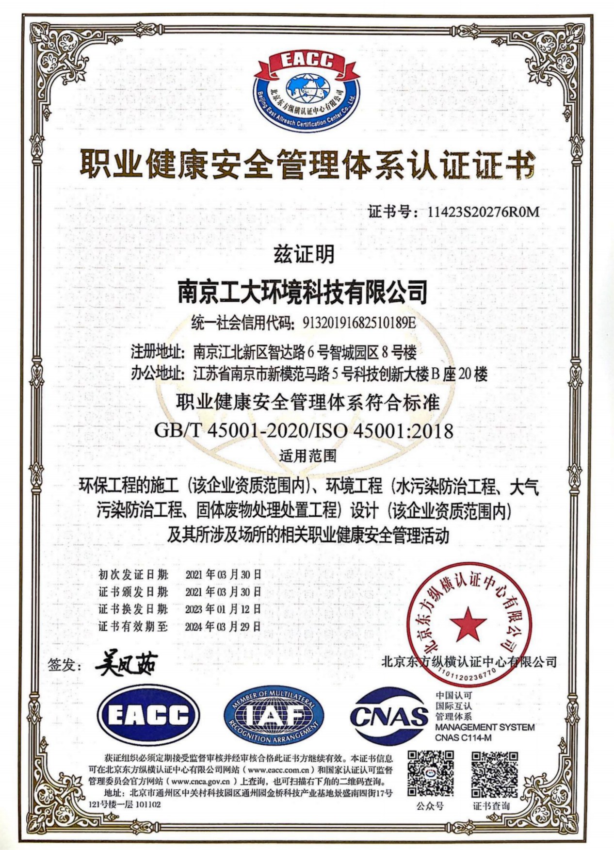 职业健康安全管理体系认证证书